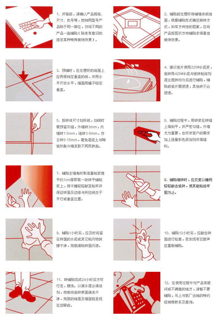 6) 一般而言,铺贴亮光的墙砖和玻化砖适合用无砂的,铺贴亚光砖和仿古地砖适合选用有砂的。